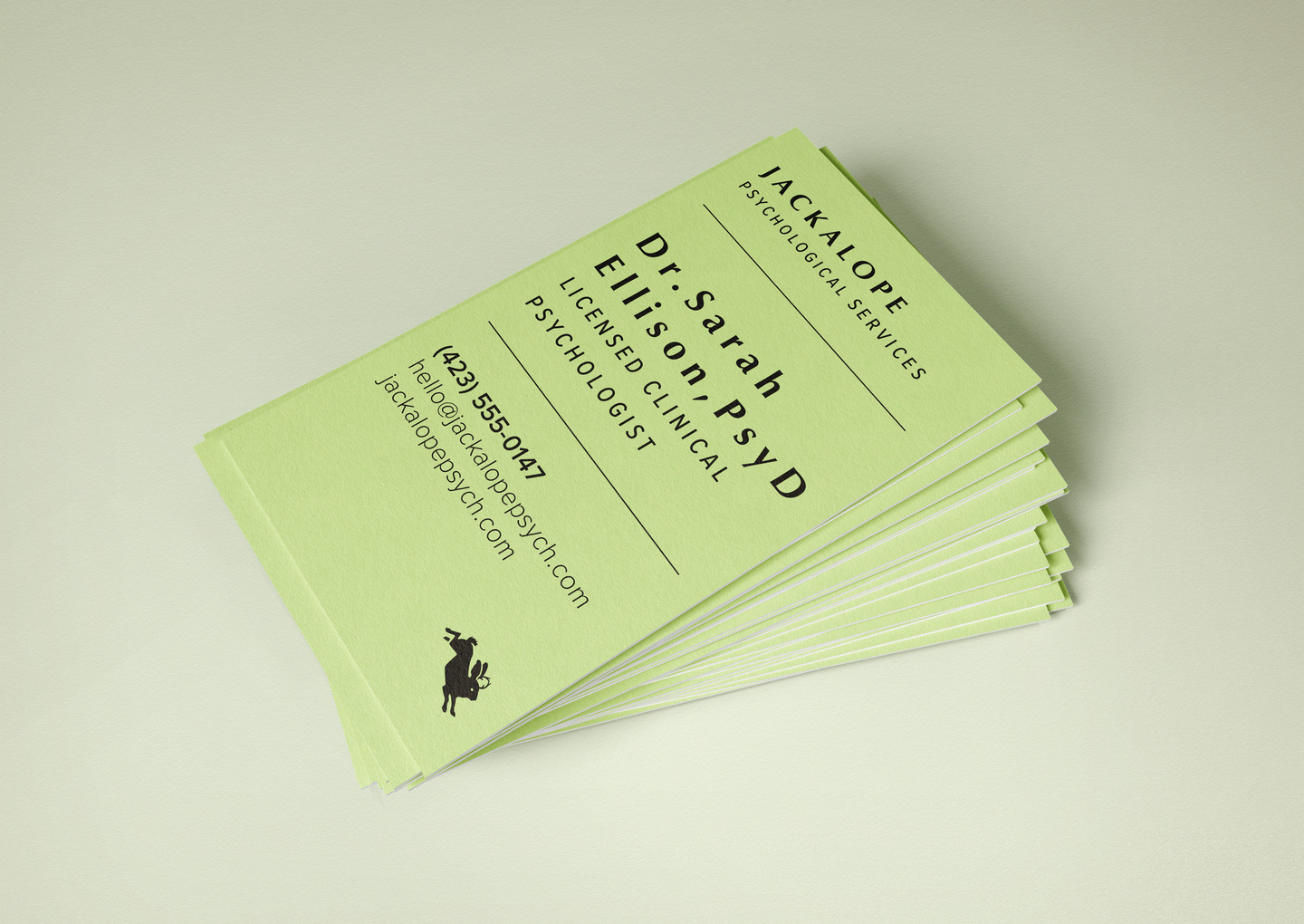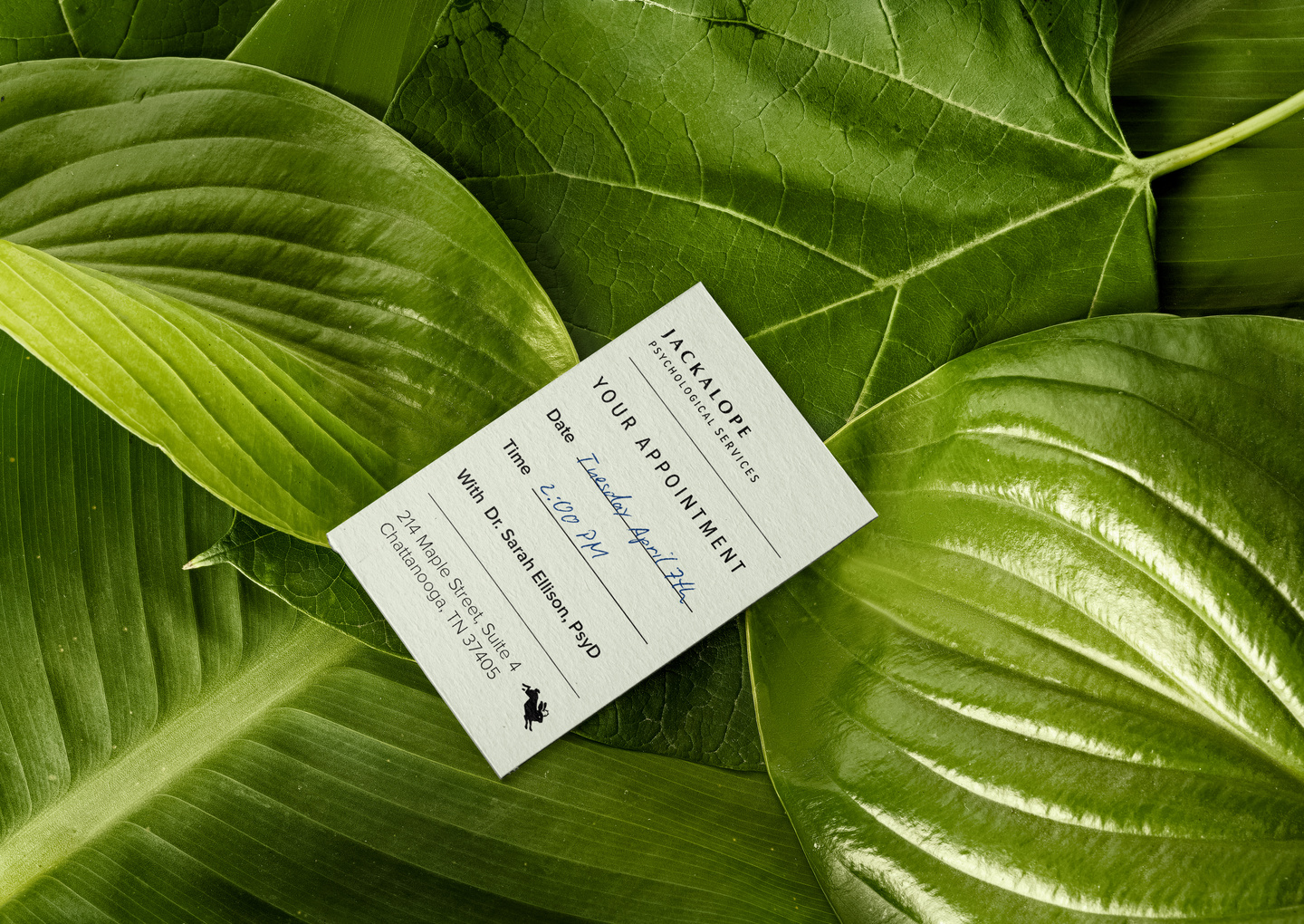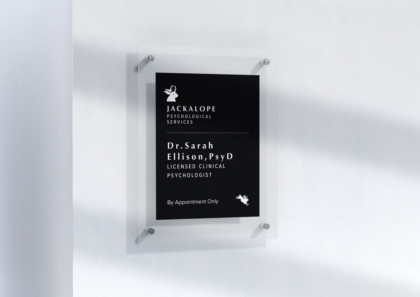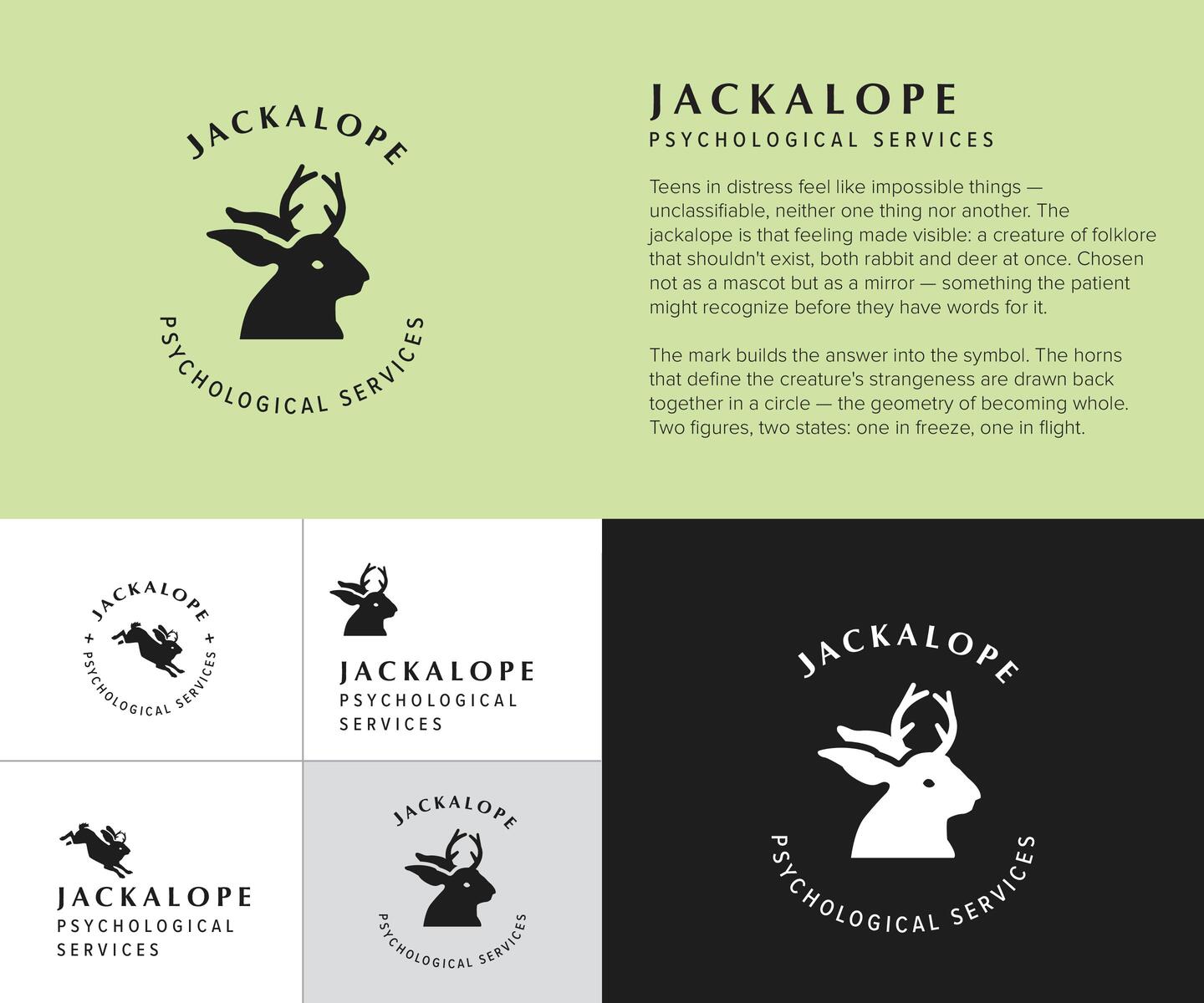 Brand identity for a clinical psychology practice serving teens and at-risk youth. The jackalope – part rabbit, part myth – was chosen because it looks the way adolescent distress feels: strange, unclassifiable, neither one thing nor another. The mark holds both the problem and the promise: horns that split come back together in a circle, the geometry of becoming whole.